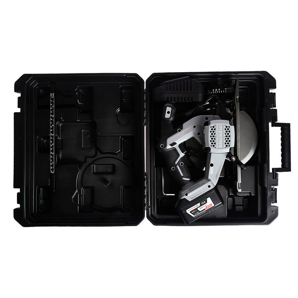 Профессиональная аккумуляторная дисковая пила для поперечного, продольного и комбинированного распиливания древесины, комбинированных материалов - фанера, ДСП, ОСП, и т.п. c вентильным бесщеточным приводом. Пила оснащена Li-ion слайдерным аккумуляторным блоком платформы АПИ.