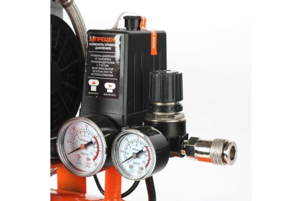 - Регулировка и контроль давления в ресивере и на выходе при помощи двух манометров.
