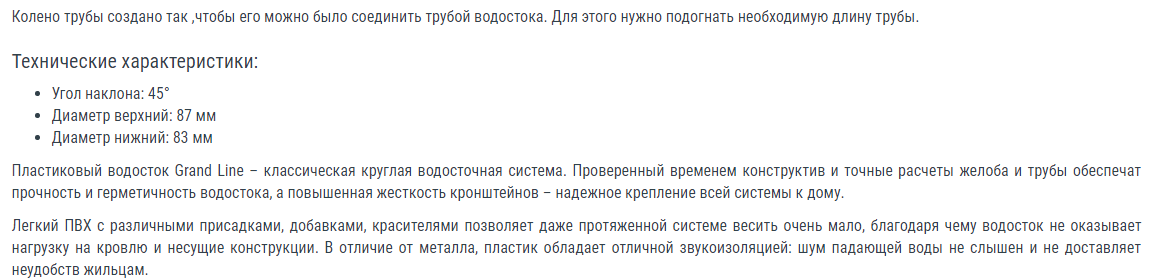 Описание колена трубы 45° ПВХ Гранд Лайн Стандарт